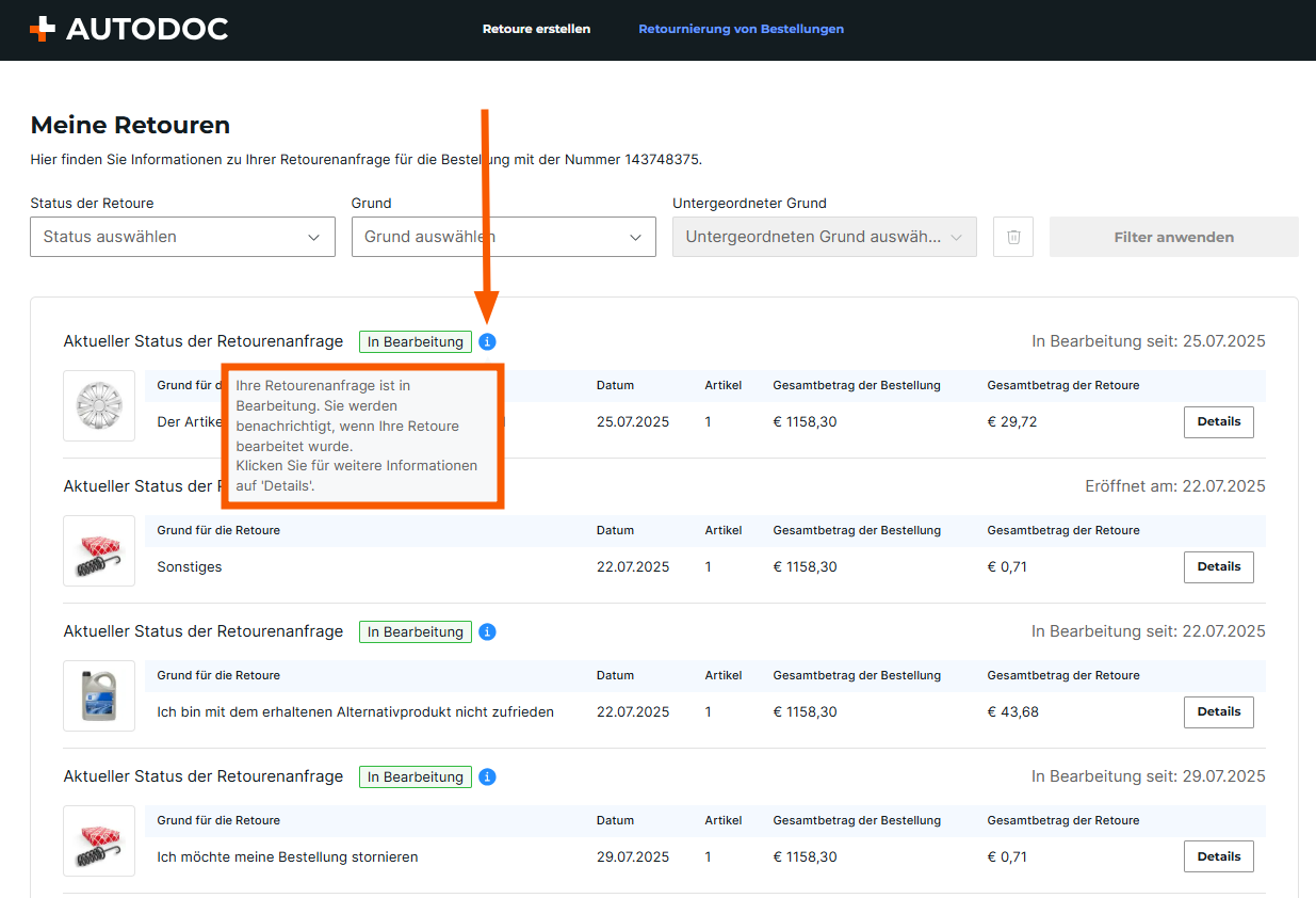 Bitte beachte: Um nähere Informationen zur Retourenanfrage angezeigt zu bekommen, musst du mit dem Mauszeiger über das Symbol 🛈 fahren.
